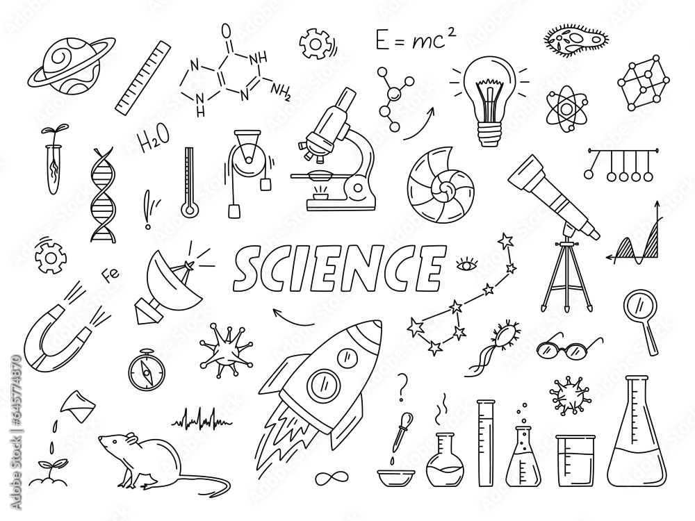 Science doodle set with rocket, constellation, telescope, microscope, flask, books, DNA, magnet, planet, radio telescope in doodle style. Vector line art ...