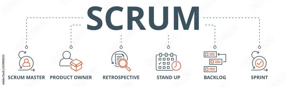 Scrum banner web icon vector illustration concept with icon of scrum master, product owner, retrospective, stand up, backlog, and sprint