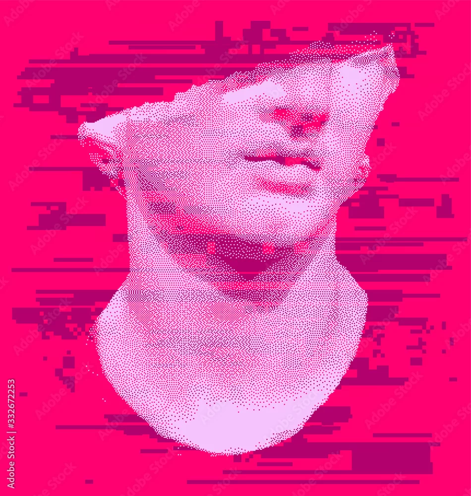 Sculpture in 8-bit pixel art style, old Hellenistic marble bust or Colossal head of a youth. Vaporwave retro style illustration.