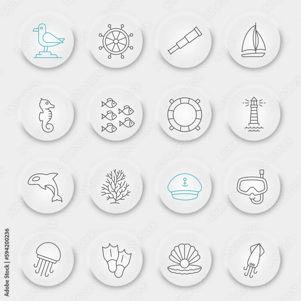 Sea and Ocean line icon set, ocean animals collection, vector graphics, neumorphic UI UX buttons, Sea vector icons, marine signs, outline pictograms, editable ...