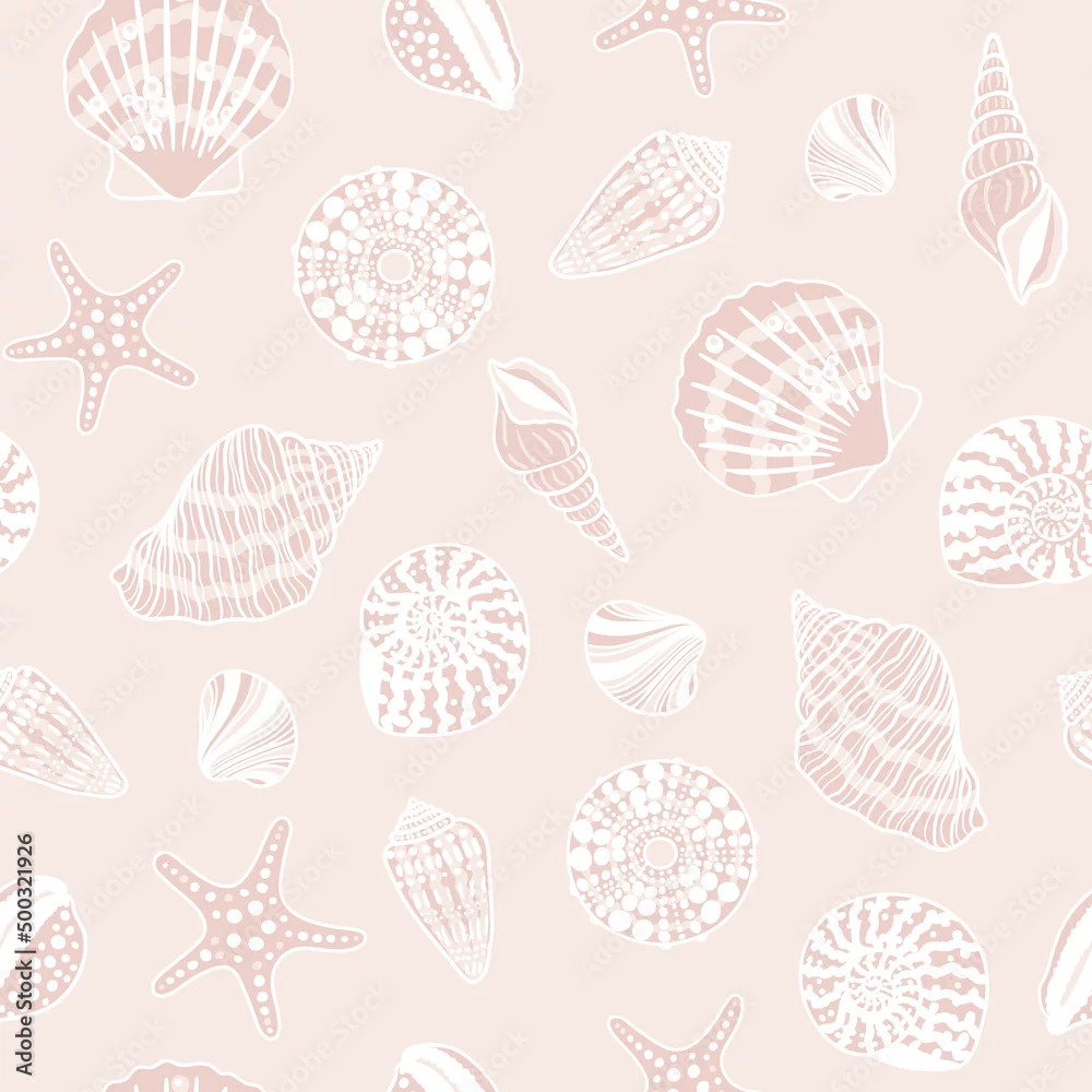 Sea shells, fossils and mollusks seamless pattern. Summer beach hand-drawn seaside vector print. Fashion textile bright multicolored illustration. Seashore ...