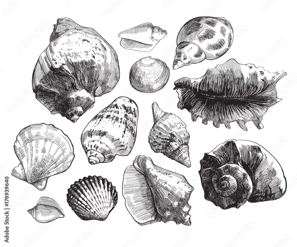 Sea shells sketch set. Black doodle seashell silhouetes isolated on white background. Vector ocean life hand drawn illustration