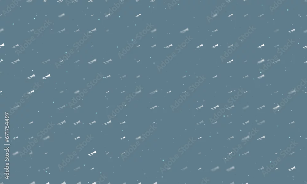 Seamless background pattern of evenly spaced white trumpet symbols of different sizes and opacity. Vector illustration on blue grey background with s ...