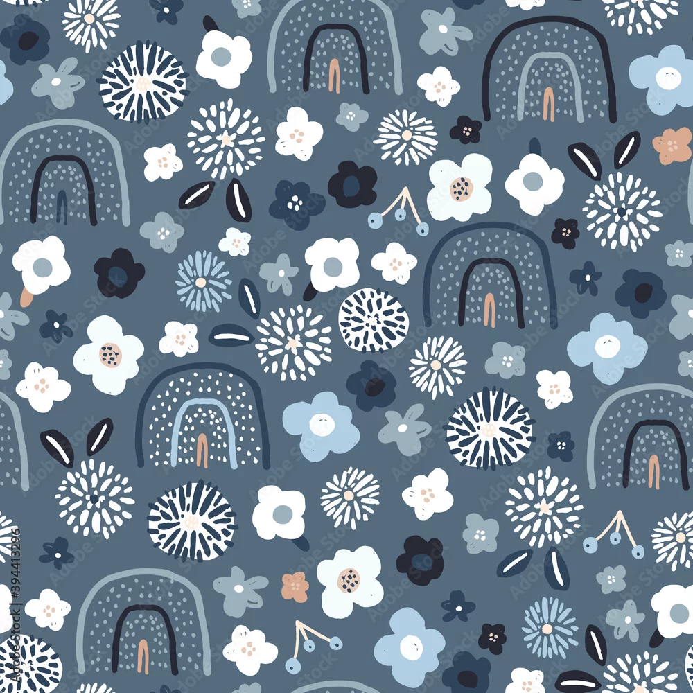 Seamless pattern with floral rainbows and hand drawn flowers. Creative blooming texture. Great for fabric, textile Vector Illustration