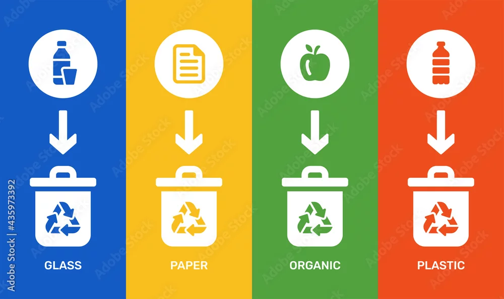 Segregate waste and store it in different bins. Garbage segregation recycling bins with trash icon symbol.
