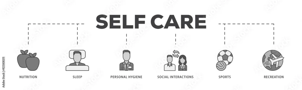 Self care icon infographic illustration concept with icon of social interactions, recreation, sports, personal hygiene, sleep, nutrition icon live stroke ...