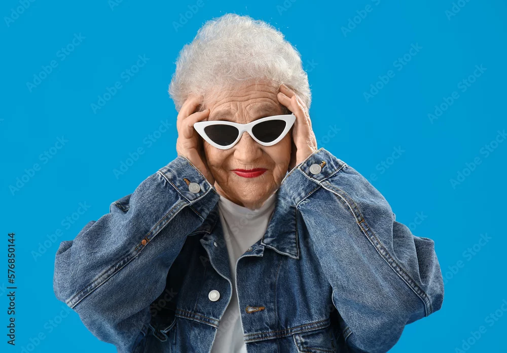 Senior woman in sunglasses on blue background, closeup