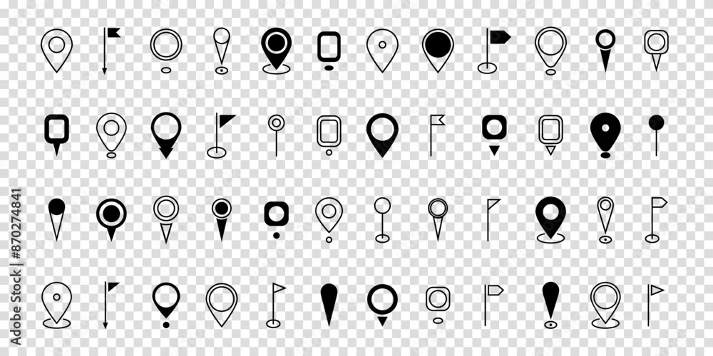 Set black location pin icon. Map pin place marker. Destination symbol. Modern Map marker pointer logo icon set. GPS pin symbol collection. Flat style. Vector illustration on transparent background.