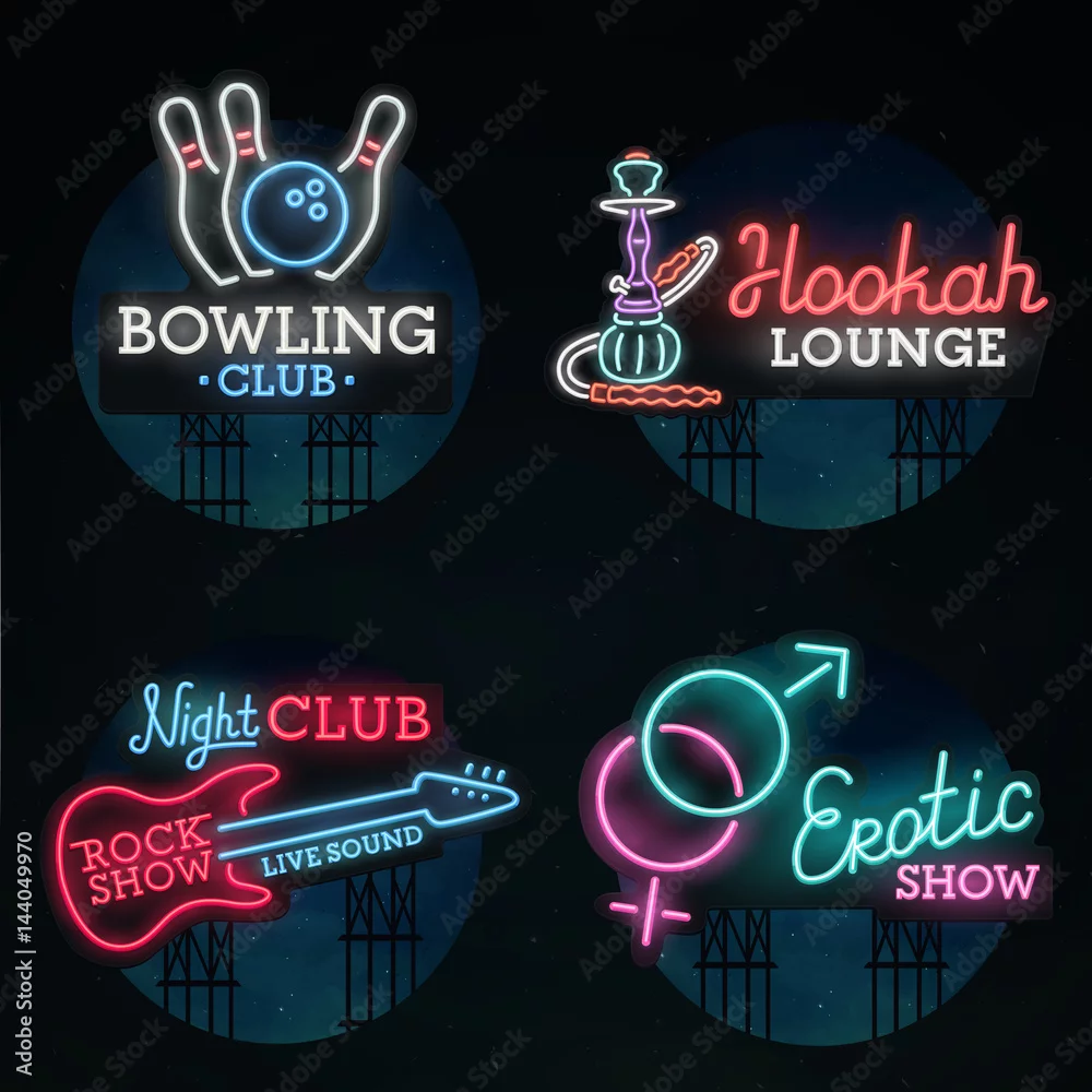 Set neon sign. Neon sign, bright signboard, light banner.