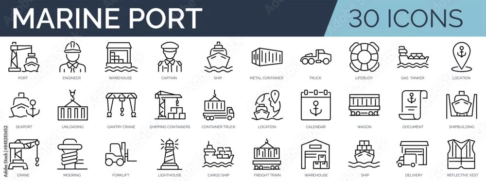 Set of 30 outline icons related to marine port. Linear icon collection. Editable stroke. Vector illustration