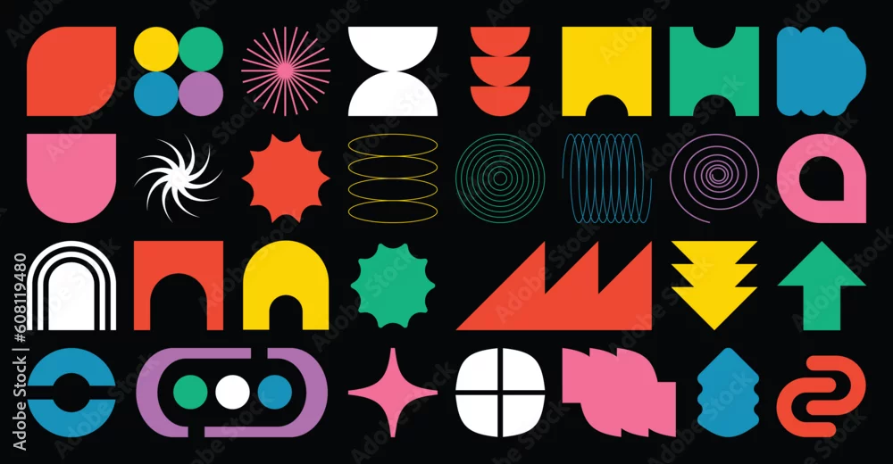 Set of abstract retro geometric shapes vector. Collection of contemporary figure, flower, doodle, square in 70s groovy style. Bauhaus Memphis design element ...