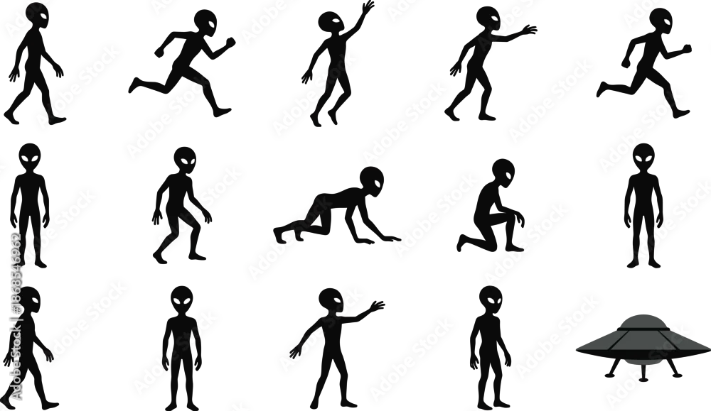 Set of alien character silhouettes in walking, running, jumping and crawling poses with UFO spaceship, black vector sci-fi icons isolated on gray background ...