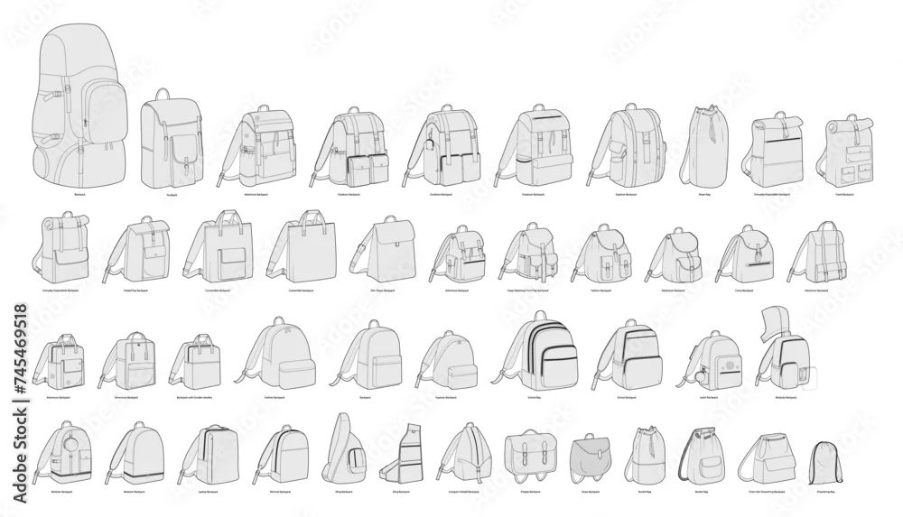Set of backpacks silhouette bags. Fashion accessory technical illustration. Vector schoolbag 3-4 view for Men, women, unisex style, flat handbag CAD mockup sketch outline isolated