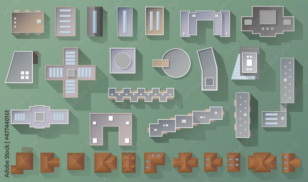 Set of elements top view for landscape design. Objects for map of City. Collection, kit of Houses, factory, buildings, skyscrapers, hotels, manufacturing, ...