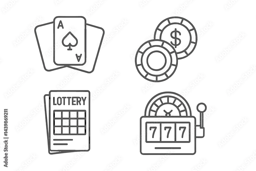 Set of web icons depicting gambling elements in line style featuring playing cards, chips, lottery tickets, and a slot machine