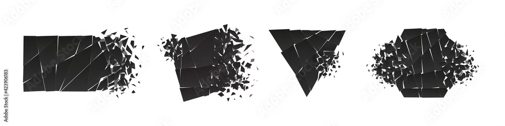 Shape shattered and explodes flat style design vector illustration set isolated on white background. Triangle, hexagon, square, rectangle and rhombus shapes ...