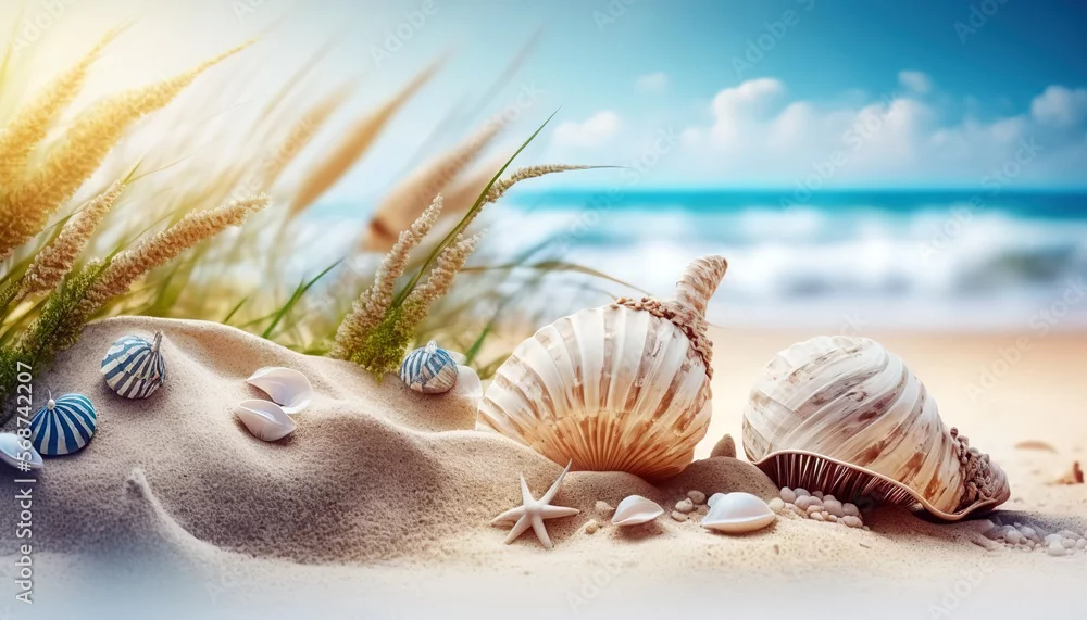 Shells on sandy beach. Tropical beach with sea shells on sand. Summer holiday concept. Post-processed generative AI