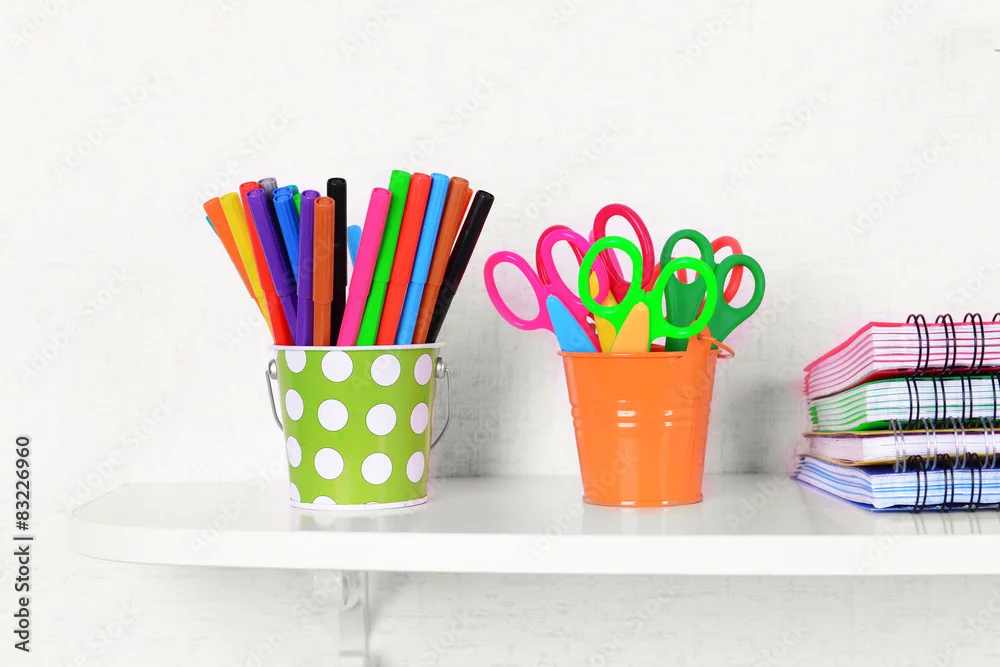 Shelves with stationery in child room close-up