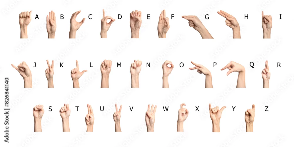 Sign language alphabet. Hand gestures and corresponding letters on white background