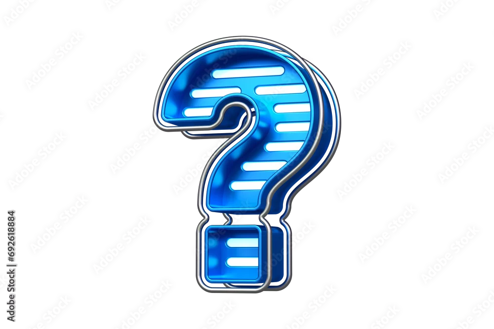 Silver and blue neon font question mark character. Nice typeface for creating titles, ad headers and eye-catching texts. High quality 3D rendering.