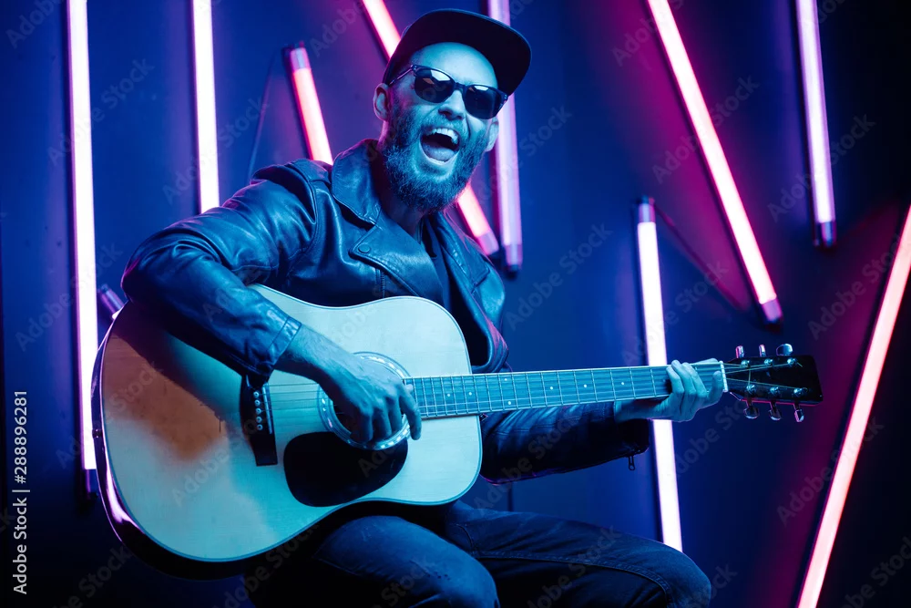 Singer and guitar player singing on a stage with neon lights. He is a rocker and he is wearing leather biker jacket or asymmetric zip jacket with black cap, jeans.