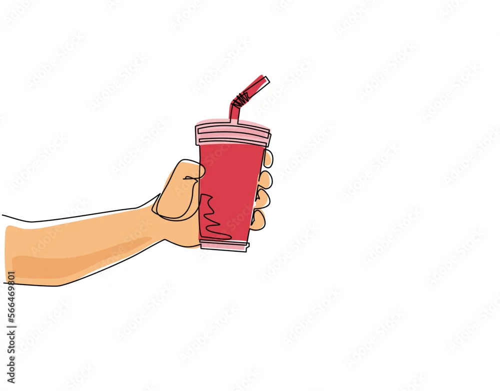 Single one line drawing hand hold paper cup. Male hand holding paper cup with straw on white background. For restaurant or cafe drink menu. Modern continuous ...