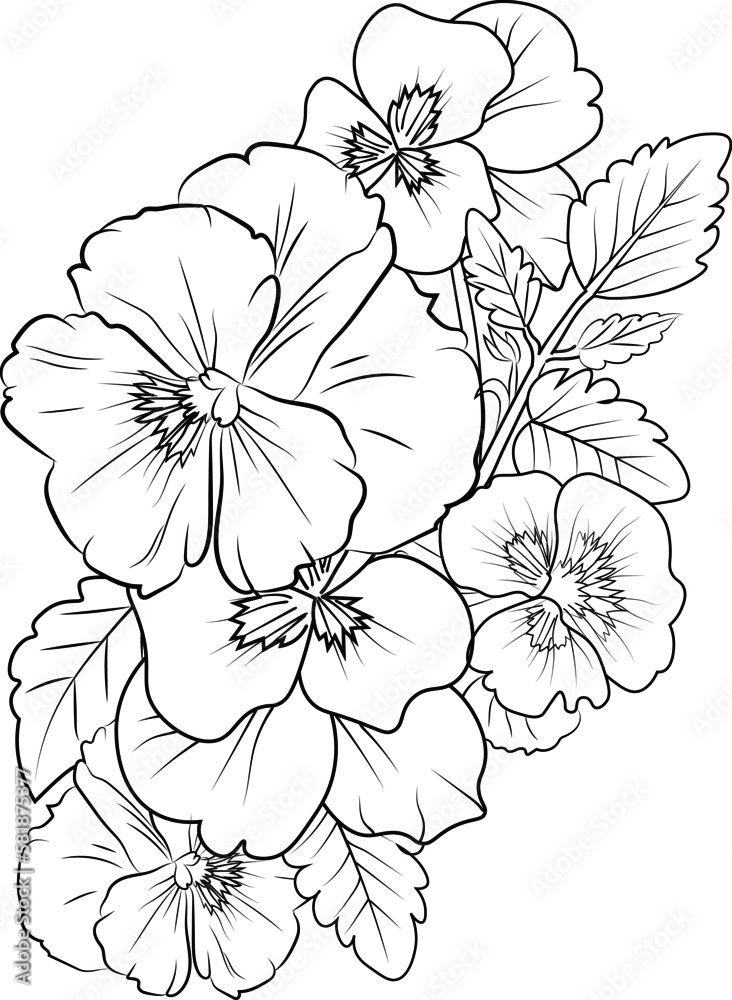 sketch contour bouquet of pansy flowers, Sketch violet flower drawing, flower cluster drawing, Easy flower coloring pages, flower coloring page for kids, ...