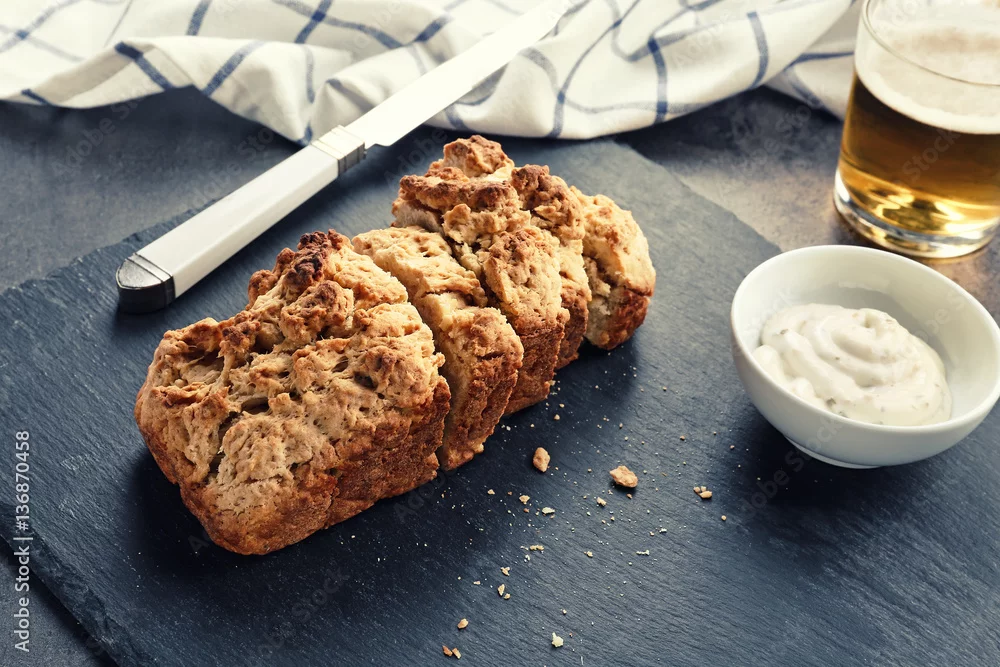 Slate plate with tasty loaf of beer bread on table