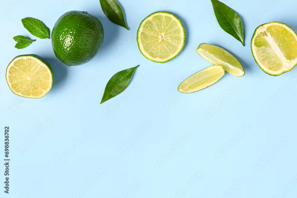 Slices of fresh lime with leaves on blue background