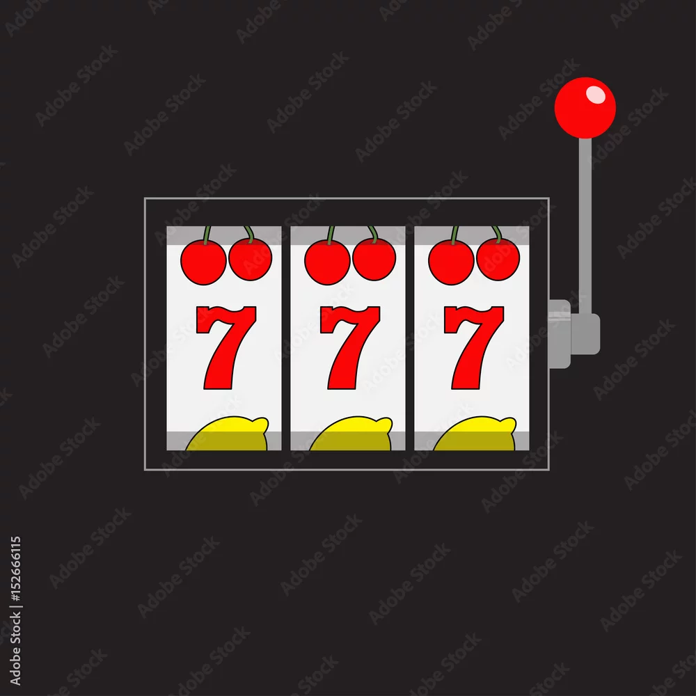 Slot machine. 777 Jackpot. Lucky sevens. Cherry, lemon row. Red handle lever. Big win Online casino, gambling club sign symbol. Flat design. Black background. ...