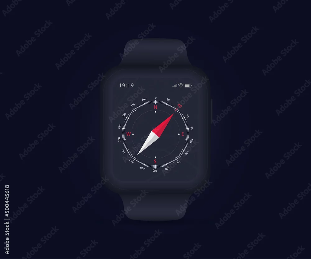 Smartwatch Compass app UI UX GUI concept, Map GPS app on screen navigation, watch weather, application compass for navigator, app map, North West South ...