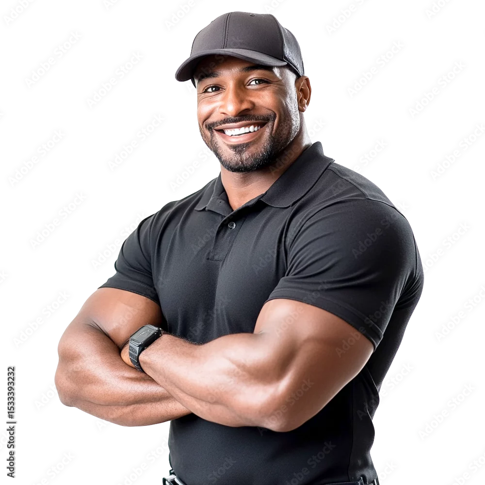 Smiling muscular Black man in black polo shirt and cap, arms crossed, transparent background