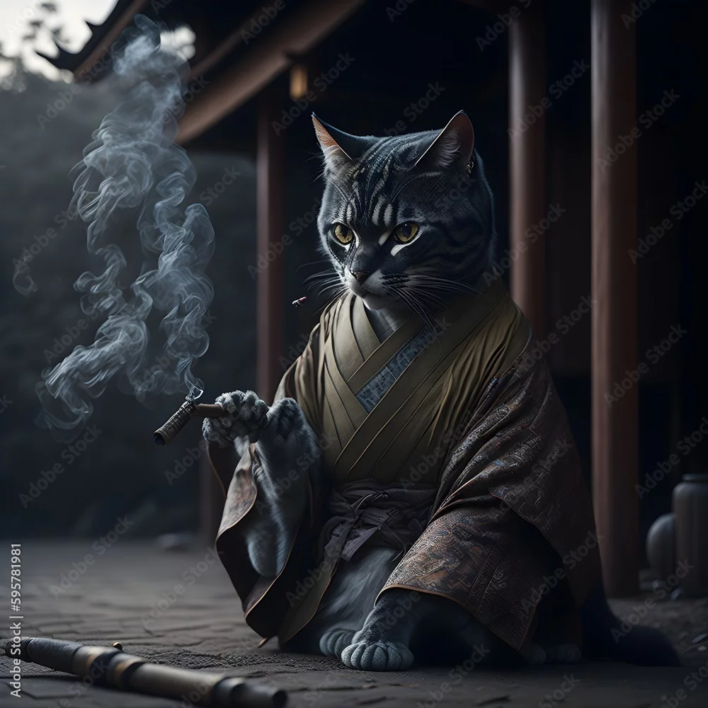 Smoking Cat, Kimono, Japanese culture, Traditional clothing, Feline, Domestic animal, Pet, Cute, Kawaii, Fashion, Costume, Dress-up, Cosplay, Asian culture, Domestic cat, Tabby cat, Animal clothe
