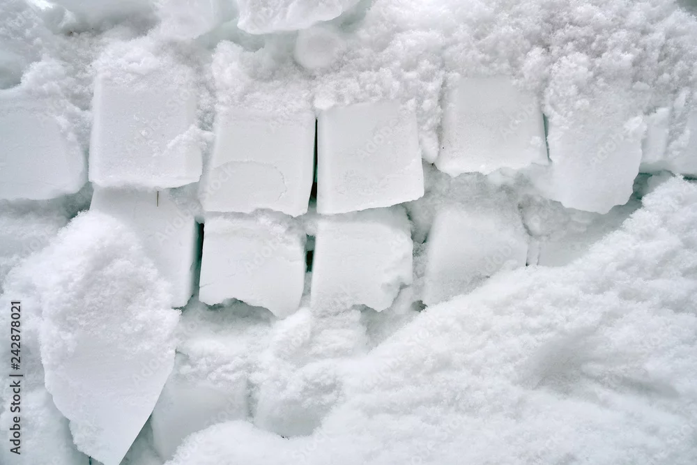 Snow bricks of a wall of a igloo house. Winter background with a wall of snow bricks.