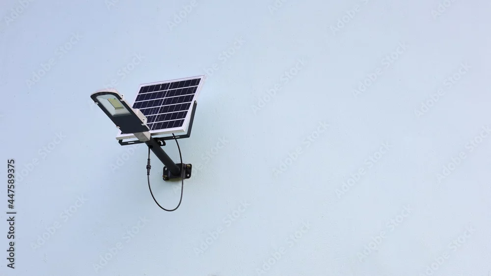 Solar cell light on the wall. A small solar panel mounted on an outdoor building wall with copy space. Selective focus