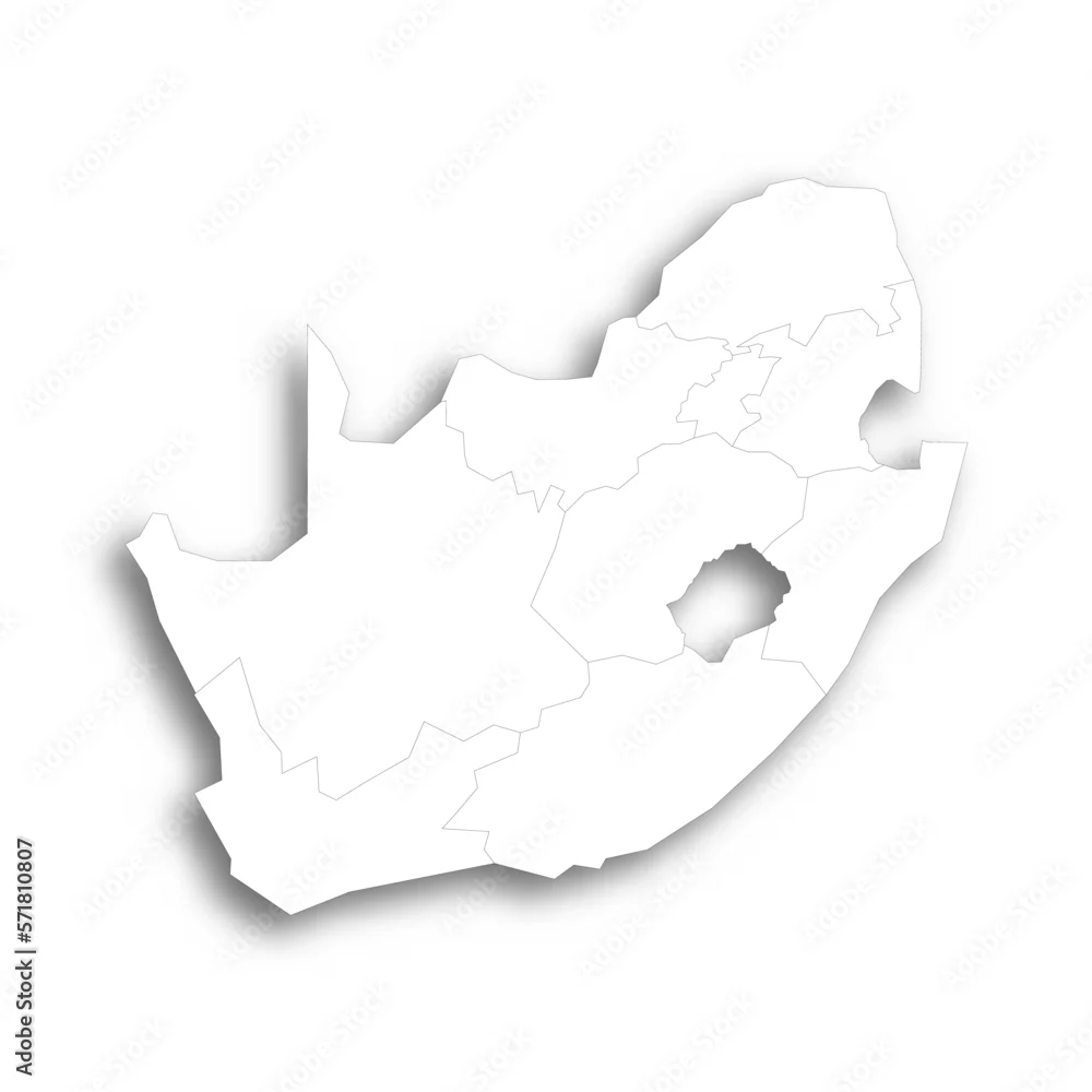 South Africa political map of administrative divisions - provinces. Flat white blank map with thin black outline and dropped shadow.