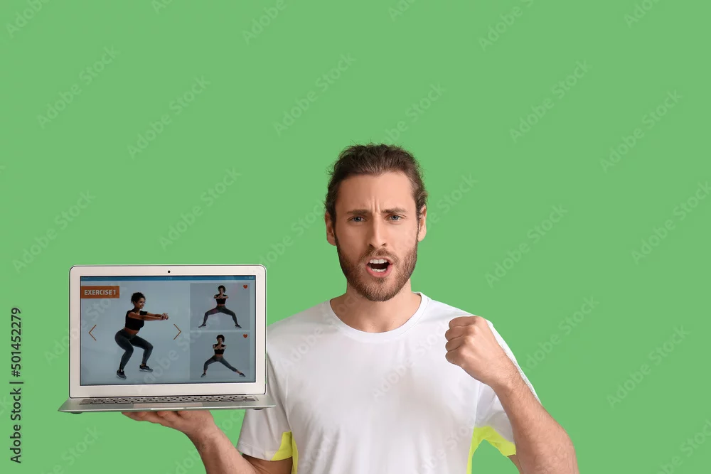 Sporty emotional man with laptop on color background. Concept of online training