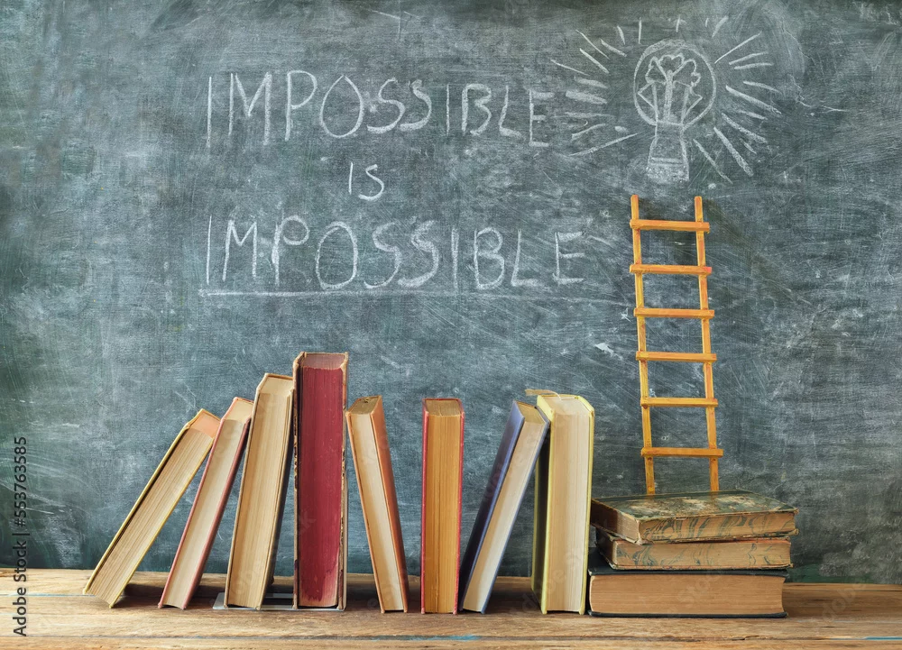 Stack of hardback books with slogan impossible is impossible on blackboard.Learning,education,development, ladder of sucess and back to school concep ...