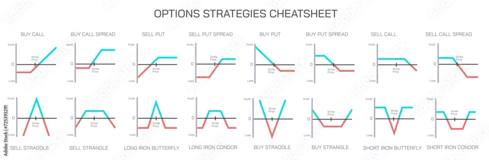 Stock market Investing and trading strategies infographics vector illustration. Types of options strategies.