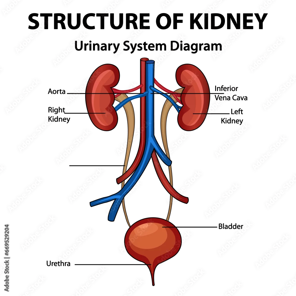 Structure of Kidney, Urinary System Diagram, Medical Education Chart of Biology for Urinary System Diagram. Vector illustration