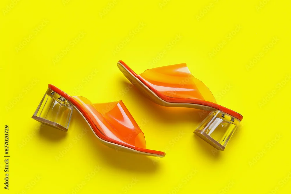 Stylish orange sandals on yellow background