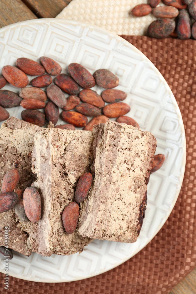 Sunflower halva with cocoa on plate, on wooden background
