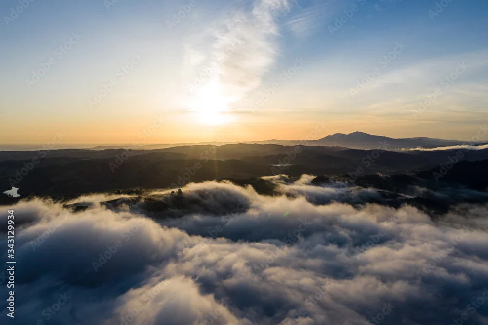 Sunrise illuminates the marine layer covering hills and valleys in California's Bay Area. The foggy marine layer is a climatic phenomenon that is an almost daily occurrence in this region.