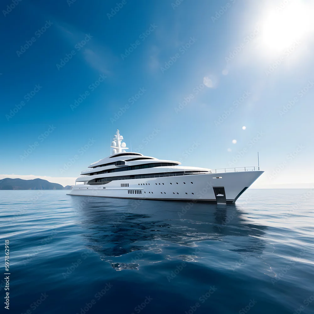 Superyacht is moving fast on the water top view. Motor Yacht in motion top view. A huge super Mega yacht in white on dark blue water created with Generative ...