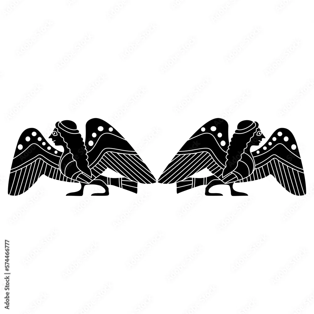 Symmetrical design with two funny ancient Greek Siren or Harpy. Half bird half woman. Fantastic mythological animal. Ethnic folk style. Vase painting motif. Black and white silhouette.