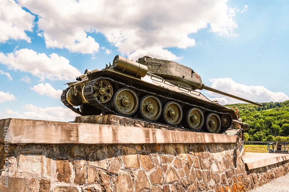 Tanks T34 and Panzer. Memorial at entrance to the Valley of Death near Svidnik in Slovakia. Most famous battlefields of World War 2 in Slovakia.