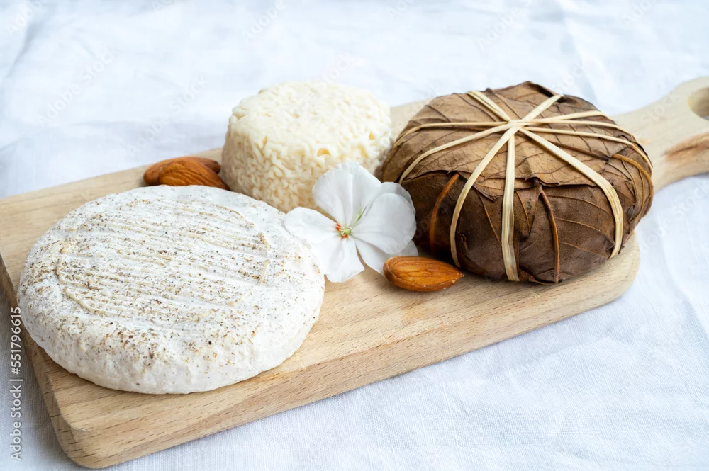 Taste of France, small round cheese Tome de Provence, matured small goat cheese and mountains cheese banon wrapped in chestnut leaves, Alpes-de-Haute-Provence, France