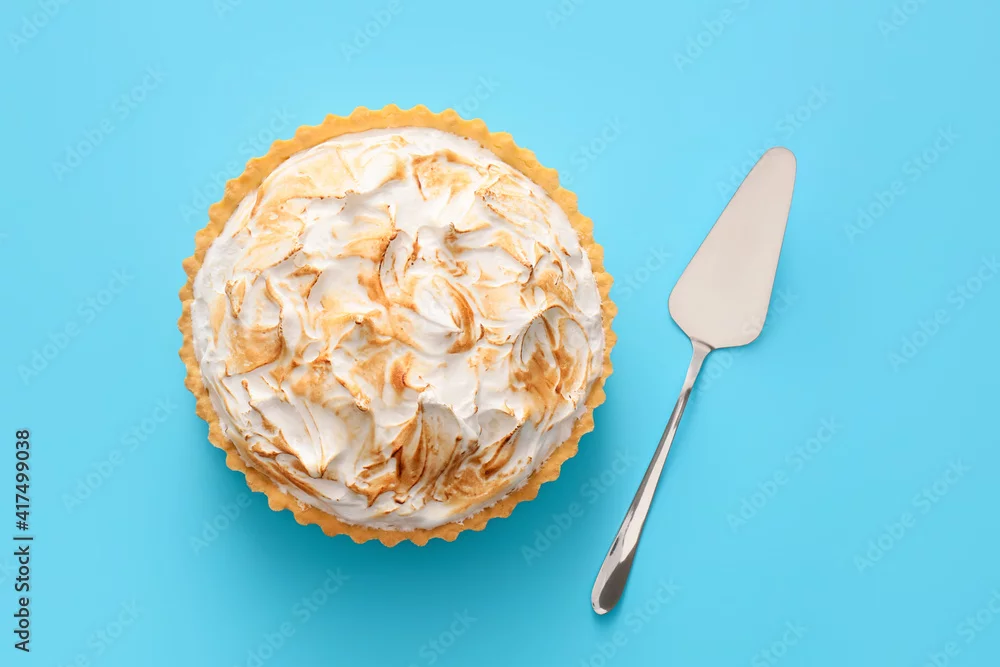 Tasty coconut pie and spatula on color background