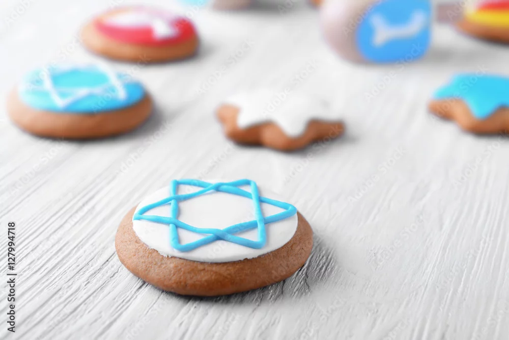 Tasty glazed cookie for Hanukkah on light wooden table, closeup