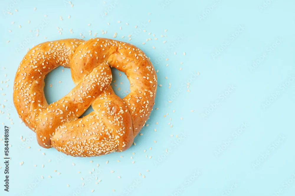 Tasty pretzel with sesame seeds on color background